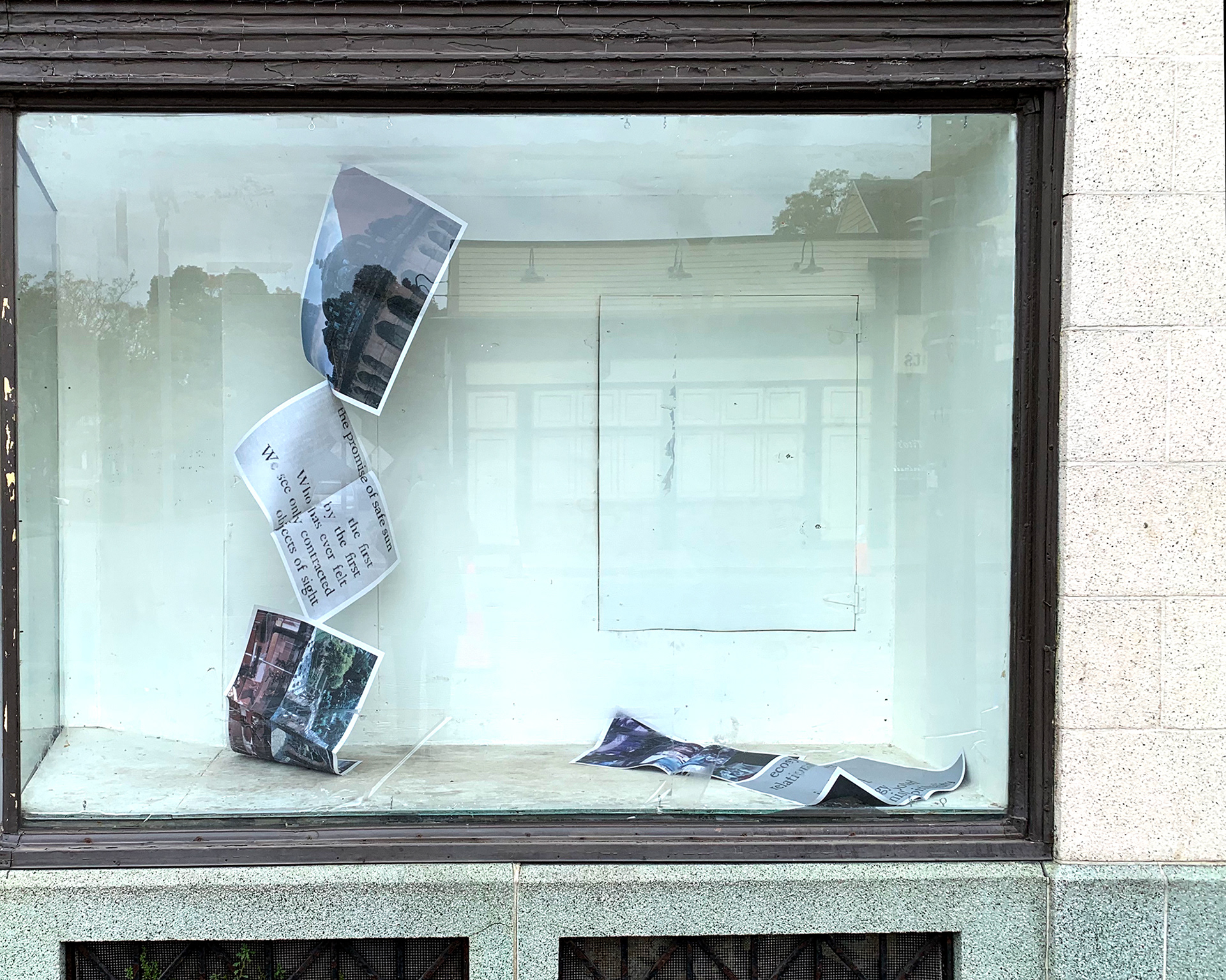 In d(ov)etail two found worlds interlock: a box of a stranger’s slides glued to a box of discarded books. Travel images sliced then spliced, scholarly words slit then knit, these discards give birth (ov) in fragmentation, assemblage, sequence, and accident. The anachronism of the slow, whirring slide projectors emphasizes a process of production that irreverently obfuscates cultural heritage in favor of non-linear conjunction of different times. From this: a tension between what we dream (idealistically easy borderless futures) and the semantic limits of those dreams (pragmatic bounded histories).